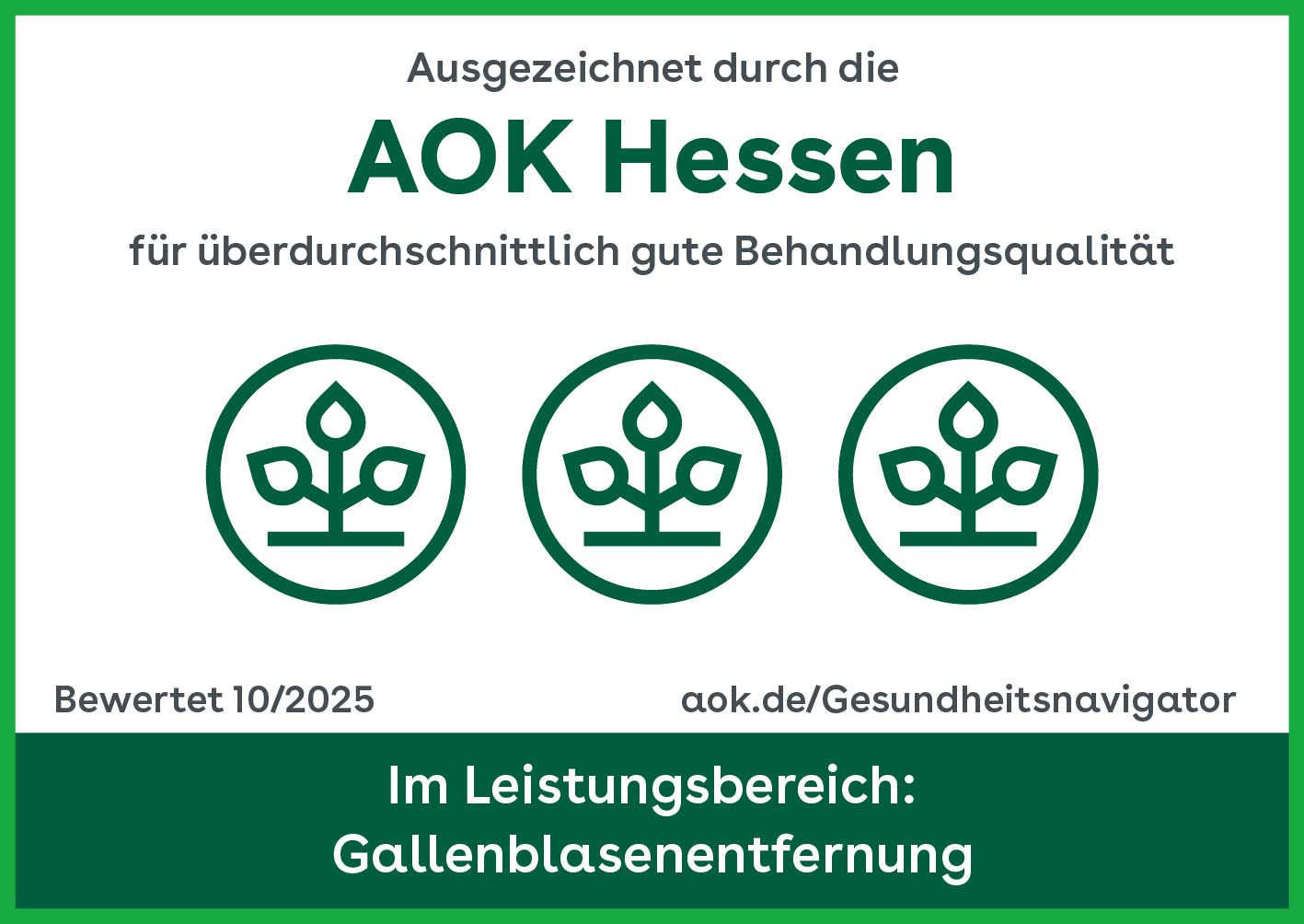 Das Herz-Jesu-Krankenhaus Fulda ist für überdurchschnittlich gute Leistungsqualität bei der Entfernung der Gallenblase bei Gallensteinen und bei Verschluss eines Leistenbruchs für das Verfahrensjahr 2025 durch die AOK Hessen ausgezeichnet worden. Hierfür stellt die AOK die abgebildeten digitalen Qualitätssiegel zur Verfügung. Die QSR-Ergebnisse sind im AOK-Gesundheitsnavigator für die Öffentlichkeit transparent einsehbar.