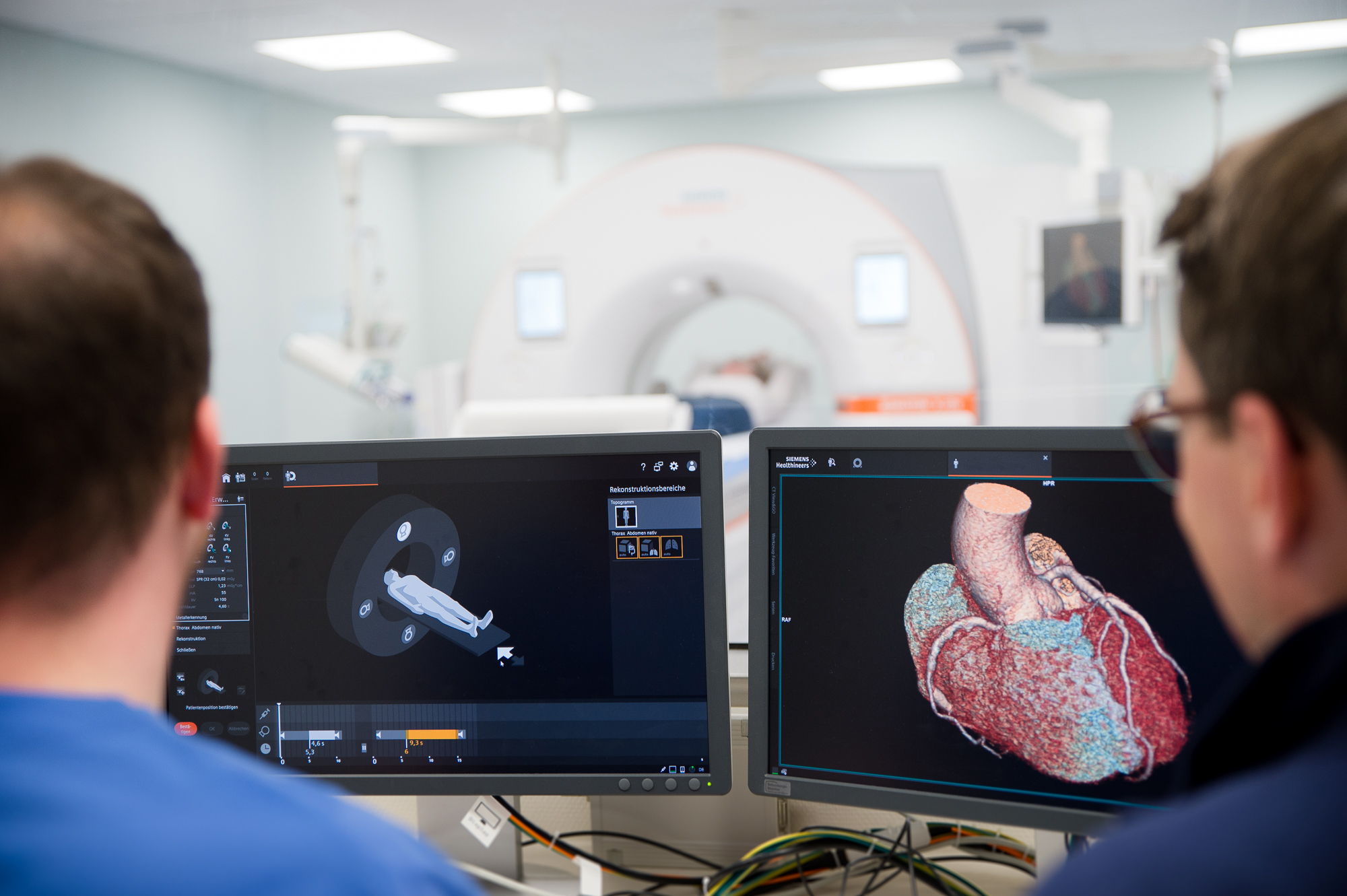 Die Mehrzeilen-Computertomographie (CT) ermöglicht die bildliche Darstellung sämtlicher Organe des Körpers in dünnen Schichten. Die Methode ist insbesondere in der Unfall- und Tumordiagnostik bzw. Behandlungskontrolle unentbehrlich. Bei einer Untersuchung des Körperstamms bspw. werden mehrere hundert Einzelbilder erstellt, wodurch es möglich wird, selbst kleinste Veränderungen der Organe zu erkennen als auch die Art und Ausdehnung von Erkrankungen oder Verletzungen exakt zu diagnostizieren. Die Untersuchung dauert üblicherweise nur wenige Minuten, häufig wird sie ergänzt durch einen weiteren Untersuchungsgang nach oder während einer Kontrastmittelinjektion.