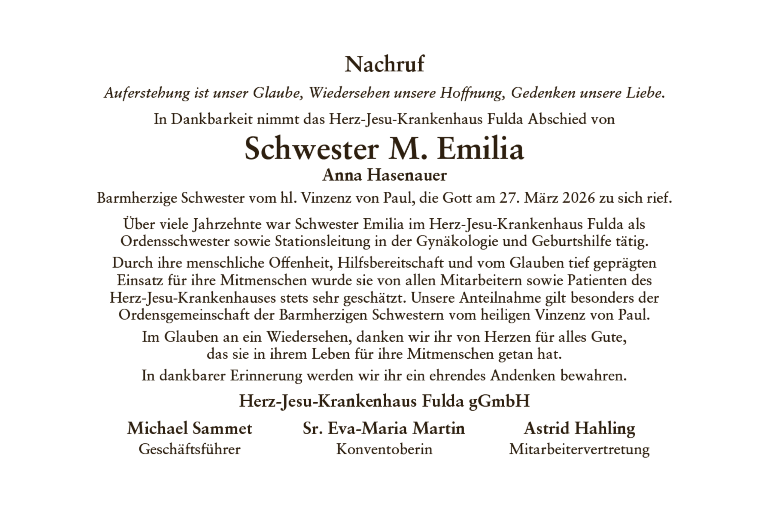 Nachruf Sr. M. Emilia