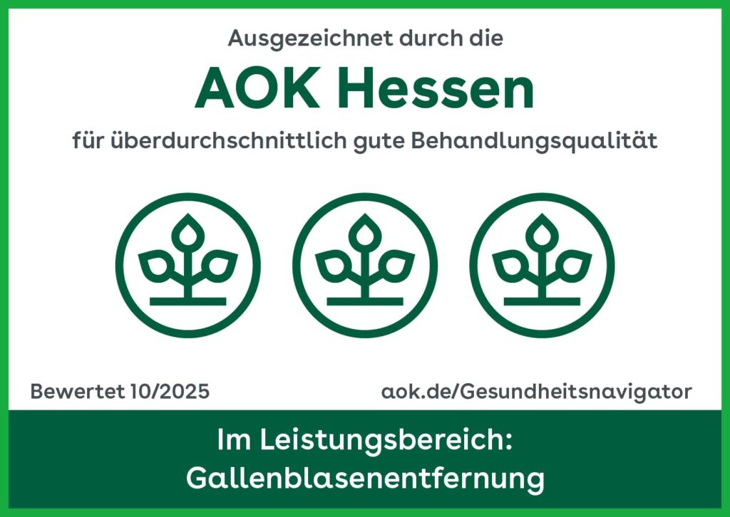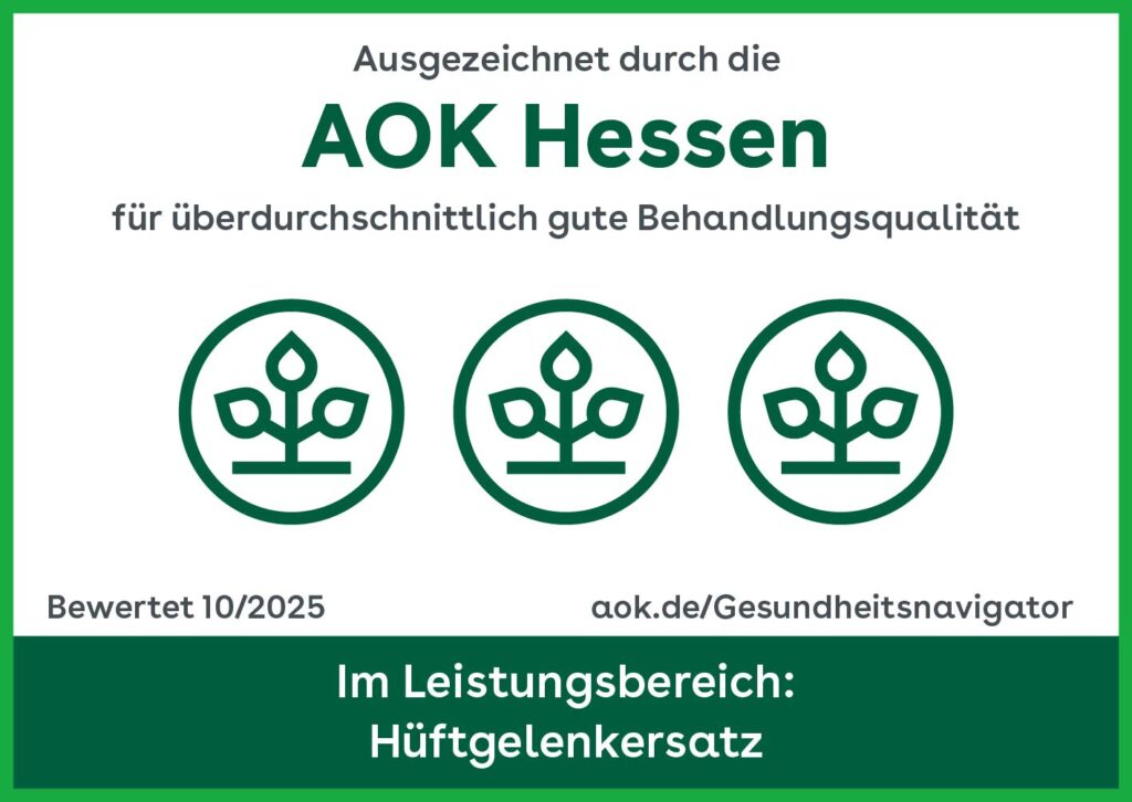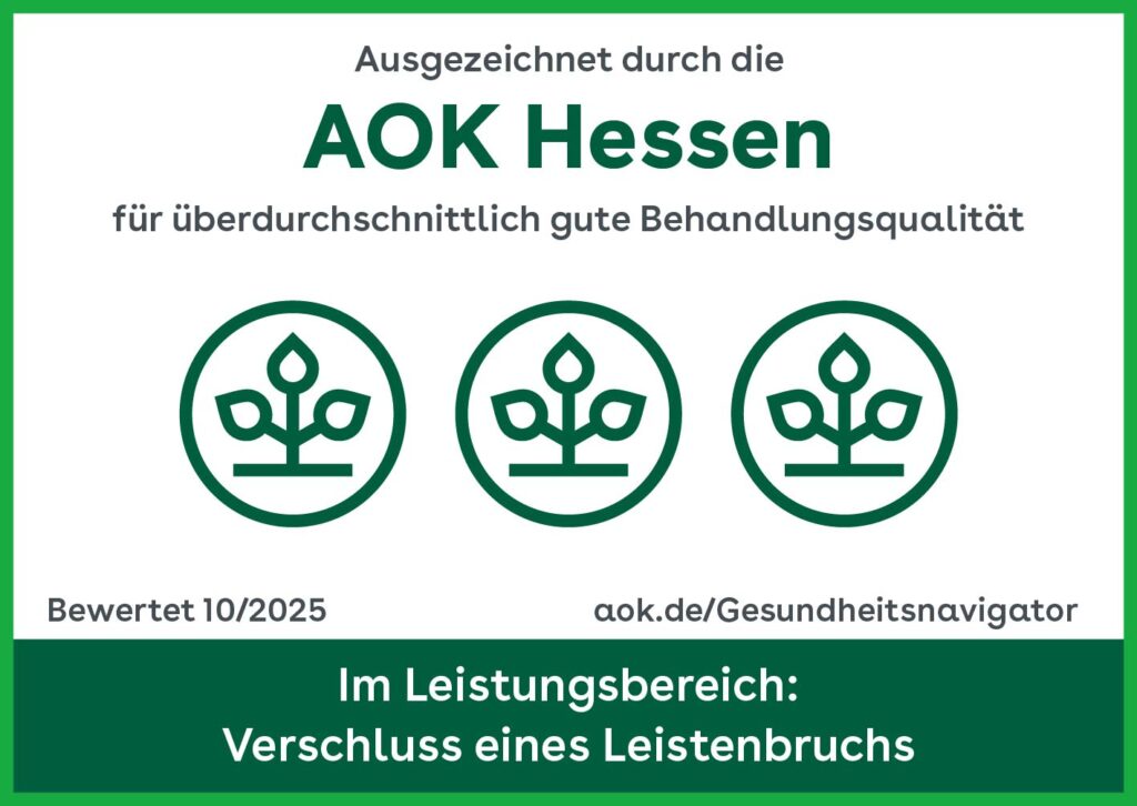 Das Herz-Jesu-Krankenhaus Fulda ist für überdurchschnittlich gute Leistungsqualität bei der Entfernung der Gallenblase bei Gallensteinen, bei Verschluss eines Leistenbruchs und für Hüftgelenkersatz für das Verfahrensjahr 2025 durch die AOK Hessen ausgezeichnet worden. Hierfür stellt die AOK die abgebildeten digitalen Qualitätssiegel zur Verfügung. Die QSR-Ergebnisse sind im AOK-Gesundheitsnavigator für die Öffentlichkeit transparent einsehbar.